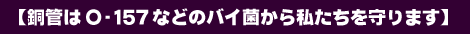 日本銅センターは旧厚生省の指定検査機関(財)東京顕微鏡院に対しO-157への銅の抗菌力効果の確認検査を依頼したところ「極めて高い抗菌効果が認められた」という結果が得られました。銅管はもっとも抗菌性にすぐれ、衛生的な配管材といえます。